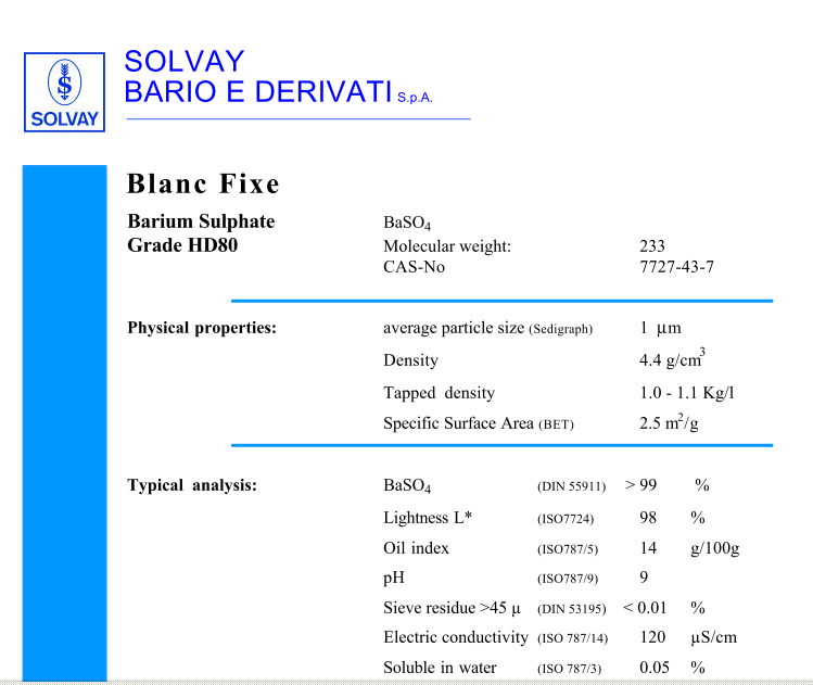 Solvay Blance Fixe 是一種化學沉澱的純硫酸鋇。可用作擴展劑。它具有細微性分佈窄、